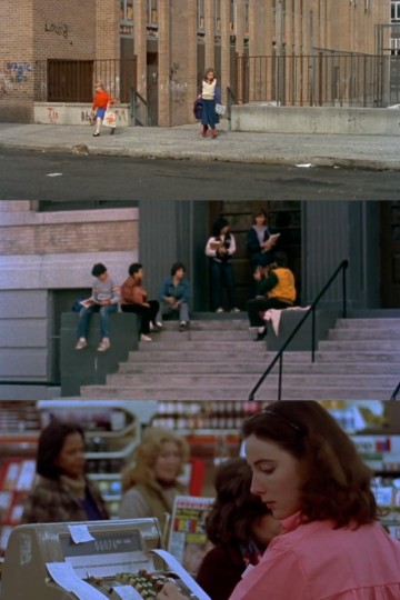 个人最喜欢的是那些閒笔,自然、克制、不动声色的节奏。破烂的街道,放学后台阶上说说笑笑的孩子们,洗衣房和坐在柜子上读杂志的女人,百货超市裡形形色色的女人们和对今天的我们来说稀奇而仍美丽的机器、秋千与随意而和睦的落叶……