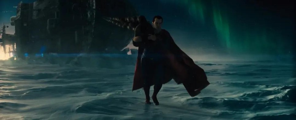 开场蒙太奇石头人拖曳船只靠岸的镜头,让人联想到《蝙蝠侠大战超人》的经典场景。