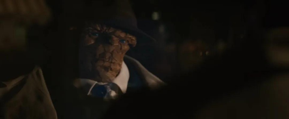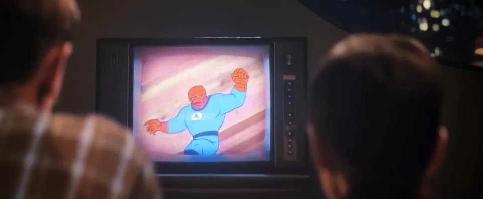 小朋友观看《神奇四侠》动画片的场景,在后续剧情中得到呼应,当石头人和路人对话时,他说的正是这部动画。