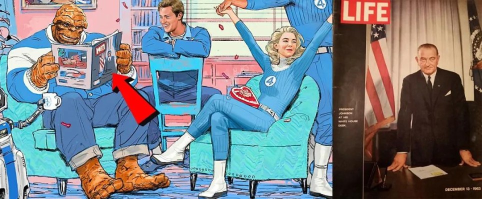 《神奇四侠》情人节海报中,石头人翻阅的《生活》杂志封面是林登·约翰逊,1963年他因肯尼迪遇刺继任总统,暗示即便肯尼迪在这个宇宙幸存,总统之位依然易主。