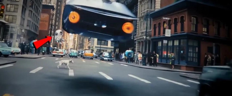 车辆腾空而起时,背景里牵着斑点狗散步的飞行机器人,彰显着这个复古未来世界的设定。