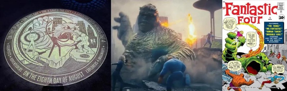 地碑上镌刻的巨怪之战场景,既还原了电影中四侠与巨怪的对决,又复刻了《神奇四侠》创刊号封面设计。