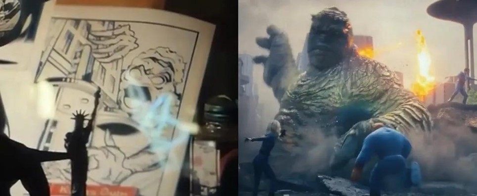 杰克·科比正在绘制巨怪草图,电影开场四侠对战的怪兽,这一场景精准还原了杰克·科比1961年创作《神奇四侠》首刊封面的历史时刻。