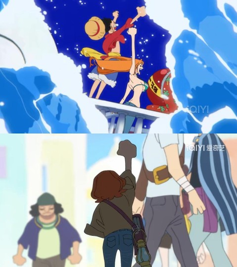 3. 从天而降拦女主的“仁王”和卡普在顶上阻拦路飞的动作、站位都很相似;